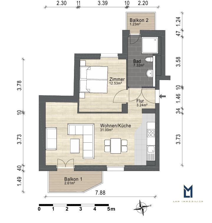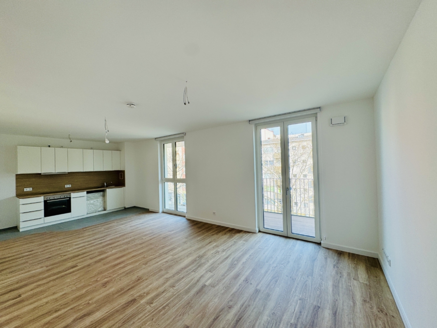 Die Einheit besteht aus einem Schlafzimmer, einem Wohn- und Essbereich mit offener Küche, einem großzügigen Duschbad sowie zwei Balkonen.