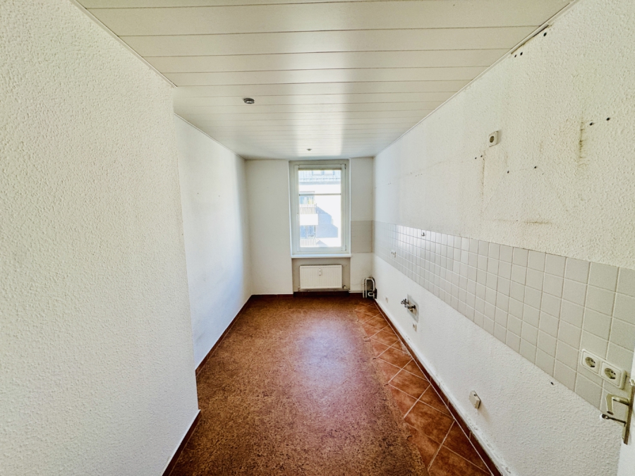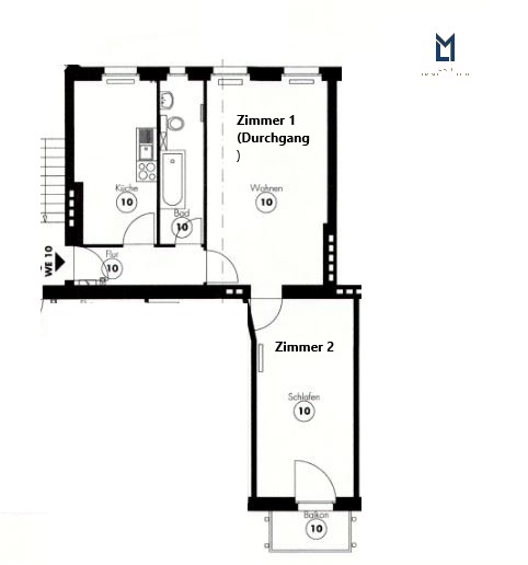 Die Wohnung verfügt über zwei Zimmer – eines davon als Durchgangszimmer –, einen Balkon, eine separate Küche sowie ein gefliestes Tageslichtbad.