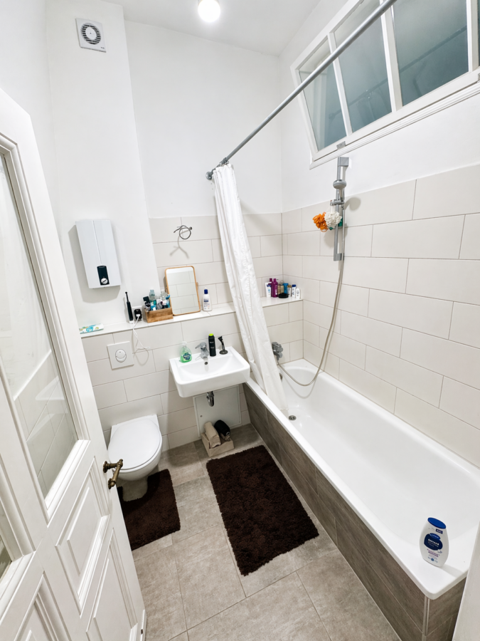 - gefliestes Badezimmer mit Wanne