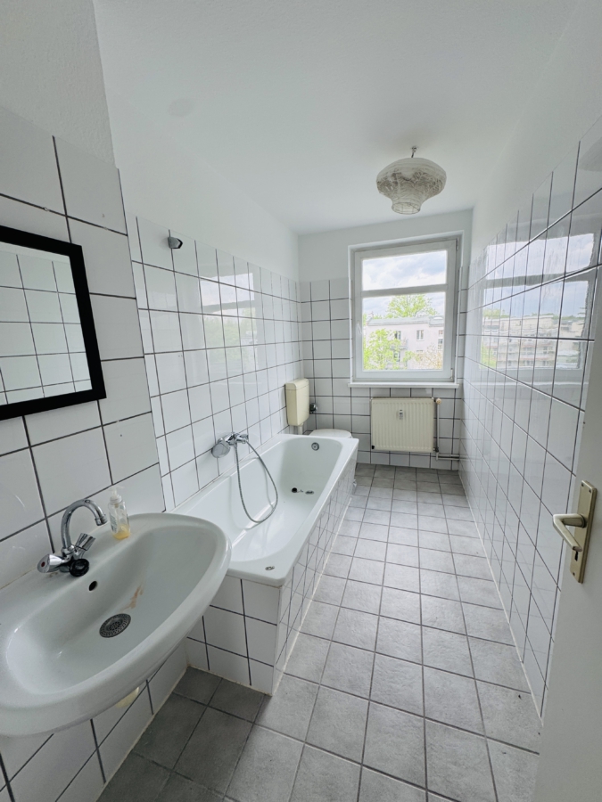 - Gefliestes Badezimmer mit Badewanne und Tageslichtfenster