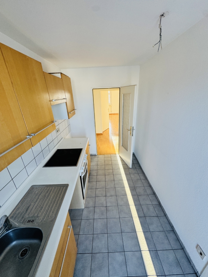 Die Wohnung verfügt über ein Schlafzimmer, ein weiteres Zimmer sowie ein Wohnzimmer, das als Durchgangszimmer genutzt wird, und eine Durchgangsküche.