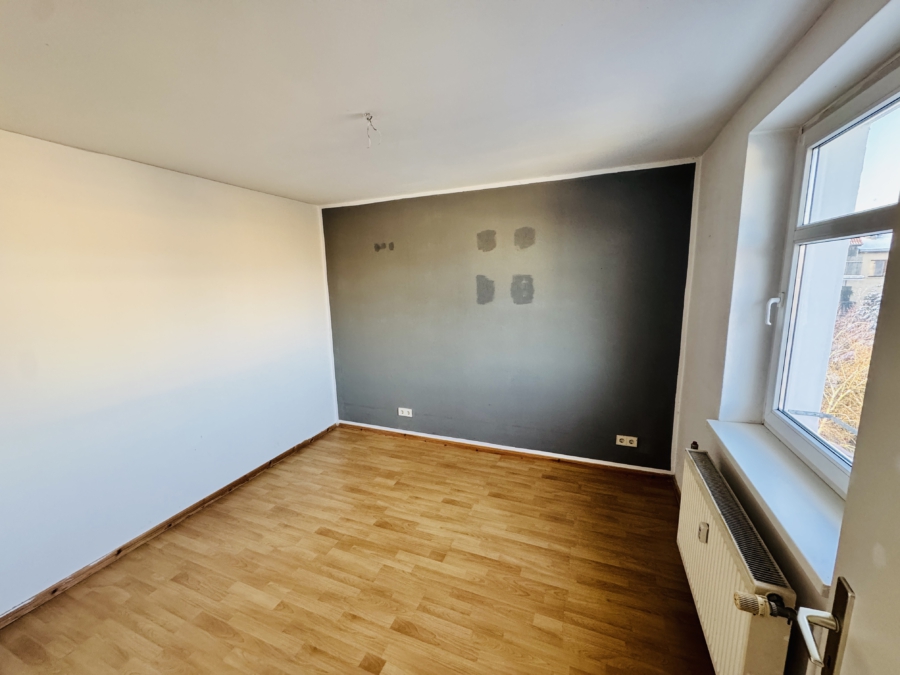 Durch das Entfernen der Wand zwischen Küche und einem Zimmer kann ein großzügiger Wohn- und Essbereich mit offener Küche geschaffen werden. Zudem besteht die Möglichkeit, zwischen den beiden weiteren Zimmern einen kleinen Flur zu realisieren, sodass künftig alle Räume separat begehbar sind und keine Durchgangszimmer mehr vorhanden wären.