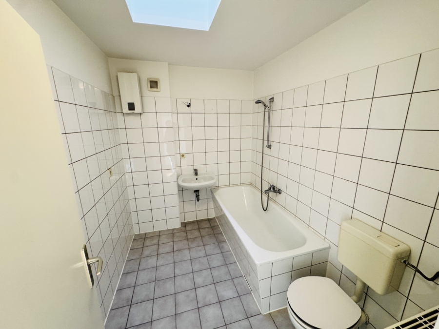 Gefliestes Badezimmer mit Badewanne und Tageslichtfenster